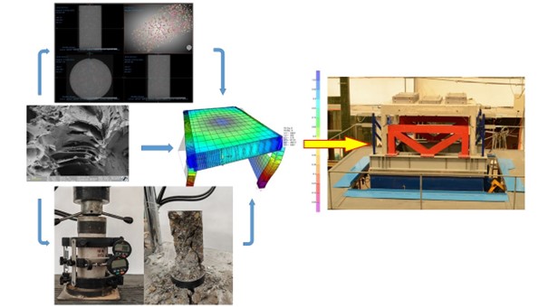 Eficienţa energetică a materialului dezvoltat şi comportamentul unui model 3D la scară supus acţiunilor seismice – Se vor considera mai multe tipuri de modele 3D la scară ce vor avea configuraţii diferite. Aceste diferenţe constau, în principal, în modul de realizare al închiderilor prin: pereţi alcătuiţi în întregime din beton sustenabil; pereţi din zidărie alcătuiţi din elemente ceramice cu goluri verticale umplute cu beton sustenabil; pereţi din blocuri de zidărie alcătuite din beton sustenabil. Determinarea pierderilor de căldură se va face folosind metodologi agreate în practica curentă. Încercările experimentale folosind platforma seismică vor conduce la cea mai bună soluţie atât din punct de vedere structural cât şi din punct de vedere al eficienţei energetice. Acest obiectiv va fi îndeplinit în luna 20 de proiect. Rezultatul scontat răspunde scopurilor 11 şi 12 din lista de obiective privind sustenabilitatea propusă de Naţiunile Unite.